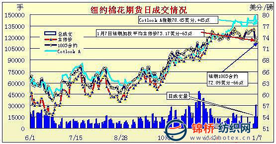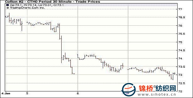 1月7日,美元走高,全球商品市場(chǎng)普遍回調(diào),紐約期棉走弱,近期合約跌破73美分的支撐,盤終跌66點(diǎn)收于72.89美分/磅。當(dāng)日期棉小幅高開后迅速回落,3月主力合約跌破73美分/磅和72.80美分/磅時(shí)激發(fā)止損賣盤,最低跌至72.56美分,為近7周最低位,低位部分買盤推動(dòng)期棉回升,縮窄跌幅。 紐約棉花期貨首期1003合約近三個(gè)交易日交易走勢(shì) |