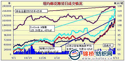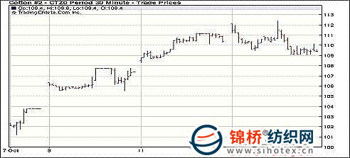 10月12日紐約期棉受到賣盤打壓走弱,結(jié)束10月5日以來的四連陽。當(dāng)日市場承接前一日漲勢,在買盤推動(dòng)下早盤走高,盤中出現(xiàn)劇烈震蕩,近期12月合約兩度沖高回落,最高至112.38美分/磅。最終各合約大幅收跌,近期12月合約收于109.58美分/磅,跌92點(diǎn);3月合約收于106.72美分/磅,跌185點(diǎn)。根據(jù)統(tǒng)計(jì),10月5日至10月11日ICE期棉近期合約累計(jì)漲幅1267點(diǎn)。 紐約棉花期貨近期1012合約近三個(gè)交易日交易走勢 |