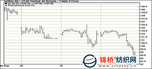 10月1日美元指數(shù)繼續(xù)大跌,農(nóng)產(chǎn)品期貨大幅走低,另美棉新花分級(jí)檢驗(yàn)量同比大增,紐約期棉遭遇獲利平倉(cāng)打壓,期棉快速下滑,盤(pán)終幾近于跌停,期棉10月和12月合約均收于100美分之下。當(dāng)日紐約期棉小幅高開(kāi),之后維持窄幅區(qū)間震蕩,然午盤(pán)后期棉一路下滑,沒(méi)有回頭之勢(shì),獲利平倉(cāng)賣盤(pán)兼止損賣盤(pán)打壓,導(dǎo)致期棉12月合約一路跌至97.92美分,盤(pán)終以98.02美分收盤(pán)。市場(chǎng)分析認(rèn)為,其一,外圍大宗農(nóng)產(chǎn)品普遍走勢(shì)低迷;其二,美棉新花上市量日漸增加,同時(shí)品質(zhì)較佳;其三,中國(guó)進(jìn)入長(zhǎng)假,國(guó)內(nèi)交易暫停。從技術(shù)上來(lái)看,期棉有繼續(xù)回落的態(tài)勢(shì)。 紐約棉花期貨主力1012合約近三個(gè)交易日交易走勢(shì) |