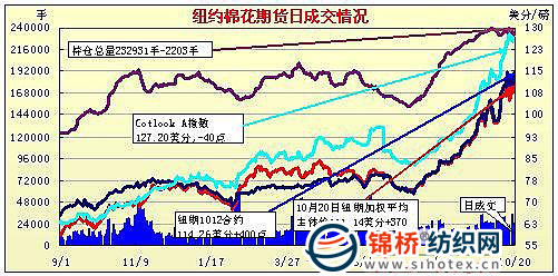 10月20日美元走弱,商品市場整體上揚,紐約期棉受外圍帶動大幅反彈,收于漲停,全面收回前一日跌幅。當日市場高開高走,因美元走勢下滑,商品市場受到投機買盤的支持,原油、大豆及玉米等均紛紛走強,紐約期棉受到外圍市場帶動,在買盤支持下,大幅攀升并達到漲停板。盤終12月合約收于114.26美分/磅,漲400點;3月合約收于109.21美分/磅,漲400點;其它遠期合約漲幅較小。 紐約棉花期貨近期1012合約近三個交易日交易走勢 |