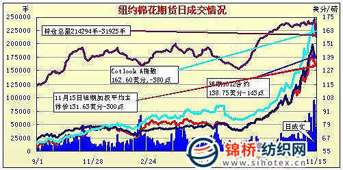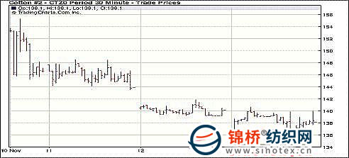 11月15日紐約期棉盤(pán)中劇烈震蕩,最終收盤(pán)近弱遠(yuǎn)強(qiáng),近期12月合約結(jié)算價(jià)跌破140美分/磅,至138.75美分/磅,跌143點(diǎn),主力3月合約134.2美分/磅,漲2點(diǎn),2011年5月、7月和10月合約以不同幅度收跌,2011年12月及以后合約全面收漲。在中國(guó)棉花電子盤(pán)交易開(kāi)盤(pán)弱勢(shì)的帶動(dòng)下,15日紐約期棉低開(kāi)低走,近期12月和主力3月合約迅速下跌,兩者最低價(jià)分別跌至135.41(-477點(diǎn))和128.38(-580點(diǎn))美分/磅。貿(mào)易買(mǎi)盤(pán)大量介入,市場(chǎng)從低點(diǎn)反彈,主力3月合約更受青睞。最終,市場(chǎng)以漲跌互現(xiàn)收盤(pán)。