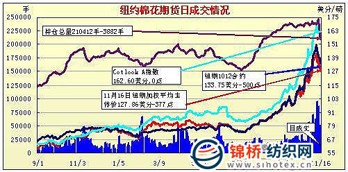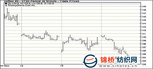 11月16日紐約期棉在美元上漲及原油等大宗商品期貨價(jià)格普遍大幅下跌的影響下,以全面下跌收盤,近期12月合約和主力3月合約均以跌停收盤,結(jié)算價(jià)分別為133.75和129.20美分/磅。當(dāng)日市場(chǎng)穩(wěn)定開盤,12月合約早盤重回140美分以上,但因外部市場(chǎng)壓力過大,市場(chǎng)未能繼續(xù)上揚(yáng),延續(xù)多日來(lái)的下跌勢(shì)頭,最終前四份合約封于跌停板。從11月10日以來(lái)市場(chǎng)連續(xù)下滑,距離最高點(diǎn)157.23美分,12月合約已經(jīng)累計(jì)下跌了2348點(diǎn)。經(jīng)濟(jì)層面上,歐盟官員努力防止愛爾蘭債務(wù)危機(jī)惡化成希臘式的災(zāi)難;中國(guó)可能加息的前景令投資者感到恐慌;美聯(lián)儲(chǔ)最近采取的行動(dòng)遭到越來(lái)越多的批評(píng)。對(duì)中國(guó)加息前景的恐慌情緒導(dǎo)致16日原油等大宗商品期貨價(jià)格普遍大幅下跌。隨著大宗商品期貨及其相關(guān)股票下跌,一些投資者指出,外部市場(chǎng)正在回吐美聯(lián)儲(chǔ)宣布回購(gòu)6000億美元國(guó)債之前的漲幅。另外,11月17日市場(chǎng)的漲跌停板幅度將擴(kuò)大到600點(diǎn)。 紐約棉花期貨近期1012合約近三個(gè)交易日交易走勢(shì)