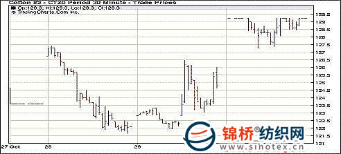 11月1日,美元走弱,外圍大宗商品上漲,中國期棉大幅走強,刺激紐約期棉周一快速升至漲停位,盤中曾短暫打破,但盤終本年度合約全部封于漲停價位。當(dāng)日紐約期棉電子盤大幅高開,看漲氣氛重新主導(dǎo)市場,期棉12月合約快速上漲300點,之后在中國期棉強勢攀升,美元走弱帶動整體商品市場走強,諸多利好刺激之下,期棉迅速攀至400點的漲停價位,雖然盤中12月近期合約數(shù)度打開漲停,但盤終再度被封于漲停價位129.26美分/磅。當(dāng)日成交較前有所回落,12月合約在第一交割通知日之前尚有15個交易日。 紐約棉花期貨近期1012合約近三個交易日交易走勢 美期棉跟隨鄭交所觸漲停板