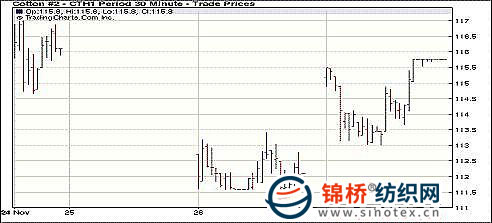 印度產(chǎn)量預(yù)期下調(diào),對(duì)市場(chǎng)形成強(qiáng)力支持,11月29日紐約期棉近期三個(gè)合約封于漲停板,主力3月合約漲停,結(jié)算價(jià)115.76美分/磅。30日市場(chǎng)漲跌停板幅度達(dá)到500點(diǎn)。當(dāng)日主力3月合約穩(wěn)定開(kāi)盤(pán),雖然外部市場(chǎng)美元受到投資者追捧美元指數(shù)上漲,但基本面上有傳言稱印度棉產(chǎn)量為570萬(wàn)噸,低于此前預(yù)期的610萬(wàn)噸,期棉獲得投機(jī)買(mǎi)盤(pán)支持,3月合約最終以漲停收盤(pán)。有分析師指出,近期ICE期棉持續(xù)弱勢(shì),吸引了中國(guó)紡織廠的積極詢盤(pán),投機(jī)商借此介入市場(chǎng)。 紐約棉花期貨近期1103合約近三個(gè)交易日交易走勢(shì) |