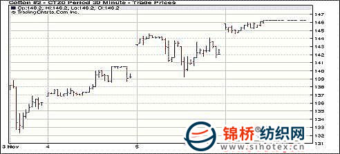 11月8日紐約期棉前五份合約全部漲停,之后合約遭遇賣盤打壓小幅下滑。近期12月合約收于歷史最高點(diǎn)146.23美分/磅,1103月合約收于142.11美分。當(dāng)日市場高開低走,盤中中國電子盤市場走強(qiáng),內(nèi)外市場聯(lián)動,紐約期棉從低點(diǎn)反彈,外部市場美元走強(qiáng),商品市場部分品種仍上揚(yáng),期棉觸及漲停板后封于頂點(diǎn)。交易商預(yù)期USDA 11月份報告中將調(diào)低中國棉花產(chǎn)量,為滿足棉花需求,需要進(jìn)口更多的棉花。這一預(yù)期對紐約期棉市場也形成支持。 紐約棉花期貨近期1012合約近三個交易日交易走勢 |