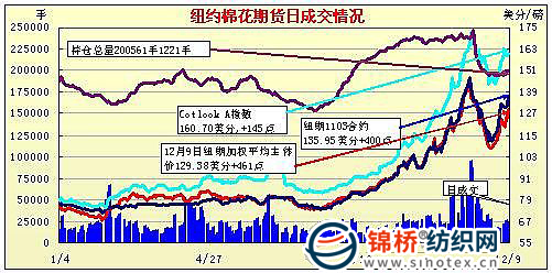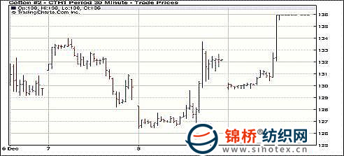 受美棉出口周報利好支撐,12月9日紐約期棉收于漲停,成交量明顯減少。當日棉市早盤走弱,3月合約最低至129.67美分/磅。后美棉出口周報公布前一周美棉簽約及裝運均超過7萬噸,這是美棉出口簽約量連續(xù)兩周達7萬噸水平,中國簽約量占近五成,受此利好支撐,期棉低點反彈,大幅沖高。盤終前3個合約收于漲停,3月合約收于135.95美分/磅,漲400點;5月合約收于128.20美分/磅,漲400點。 紐約棉花期貨近期1103合約近三個交易日交易走勢 紐約期棉漲停板