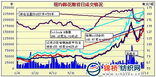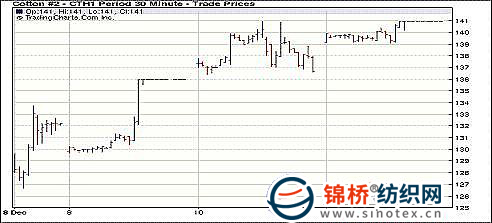 12月13日外圍市場利好促紐約期棉買盤活躍,前3個合約收于400點漲停板。當日市場高開震蕩。美元承壓,商品期貨市場及美國股市走強,促買盤活躍,助棉價飆升,3月合約接近尾盤時封漲停板。盤終前3個合約收于漲停,3月合約140.97美分/磅,漲400點;5月合約133.23美分/磅,漲400點。 紐約棉花期貨近期1103合約近三個交易日交易走勢 |