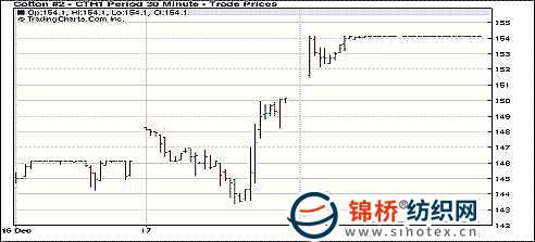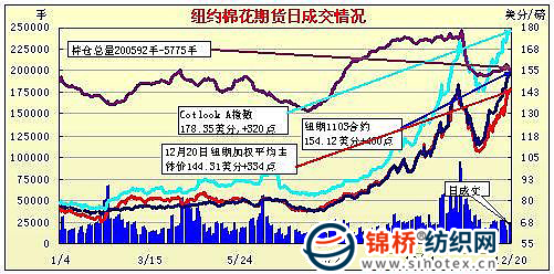 12月20日紐約期棉大幅上揚(yáng),近期合約再度收于漲停板,當(dāng)日成交量有所減少。當(dāng)日棉市小幅高開(kāi),受期權(quán)市場(chǎng)的帶動(dòng),近期合約快速?zèng)_高,很快觸漲停板,且之后一直封死漲停板,直至收盤。盤終前四個(gè)合約均收于漲停板,3月合約收于154.12美分/磅,漲400點(diǎn),打破紐約期棉近期合約于今年11月9日創(chuàng)下的歷史最高紀(jì)錄151.23美分/磅;5月合約收于142.39美分/磅,漲400點(diǎn)。目前市場(chǎng)上漲,仍主要因棉花自身基本面的利好;同時(shí)當(dāng)日美國(guó)股市及商品期貨市場(chǎng)普遍收高。 紐約棉花期貨近期1103合約近三個(gè)交易日交易走勢(shì) |