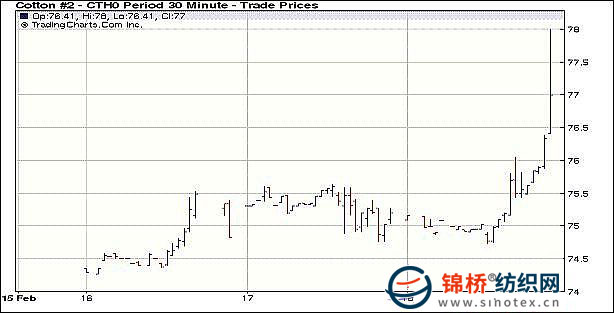2月18日紐約期棉市場飆漲,近期3月合約收于76.97美分/磅,漲173點,主力5月合約收于78.13美分/磅,漲202點;市場上漲動力主要來自技術性買盤。當日期棉市場開盤短暫穩(wěn)定,后受美元上漲和外部其他期貨市場下跌影響下滑。技術性買盤支持市場強勢反彈,主力5月合約最高上漲至78.30美分/磅(+219點);基本面上,美國農業(yè)部(USDA)第86屆展望論壇分析指出全球棉花供應偏緊,美棉出口前景樂觀,利好期棉市場。最終,市場以高漲收盤。 紐約棉花期貨首期1003合約近三個交易日交易走勢 |