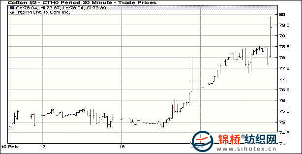 2月19日紐約期棉不顧外部美元上漲和谷物期貨下跌,前三個合約維持漲勢,遠月合約普遍下跌。近期3月合約收于78.79美分/磅,漲182點,主力5月合約78.79美分/磅,漲85點,近期和主力合約上漲至一年半來高點。 19日主力5月合約整日處于上漲勢態(tài)。雖然美元上漲致商品市場承壓,但期棉主力合約繼續(xù)受技術(shù)性買盤(3月向5月合約積極轉(zhuǎn)倉)、以及基本面美棉出口前景良好保持,漲勢不斷,最終再度收高。 紐約棉花期貨首期1003合約近三個交易日交易走勢 |