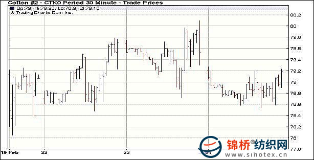2月24日市場結(jié)束連漲之勢,全面下跌,主力5月合約收于79.16美分/磅,跌61點,1007月合約收于78.64美分/磅,跌77點,獲利了結(jié)賣盤給予壓力。當日主力5月合約開盤后“上躥下跳”,雖然外部市場美元下跌及股市走強,但因有交易商投入獲利了結(jié)賣盤,市場重心向下,最終以小幅下跌結(jié)束多日連漲。分析師指出,自2月9日USDA(美國農(nóng)業(yè)部)發(fā)布供需月度報告后,期棉市場連續(xù)多日上漲,市場有回調(diào)壓力。另外,期棉價格持續(xù)上漲迫使現(xiàn)貨交易放緩,對期棉上漲有壓力。 紐約棉花期貨主力1005合約近三個交易日交易走勢 |