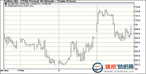 2月3日紐約期棉市場(chǎng)再度收漲,近期3月合約收于69.82美分/磅,漲56點(diǎn),5月合約71.35美分/磅,漲63點(diǎn)。盤(pán)中技術(shù)買(mǎi)盤(pán)和基本面上中國(guó)因素幫助市場(chǎng)走出一波向上行情。當(dāng)日期棉市場(chǎng)穩(wěn)定開(kāi)盤(pán)后“拔高”走強(qiáng),3月合約最高達(dá)到70.67美分/磅,與上周的高點(diǎn)平齊,激發(fā)技術(shù)性買(mǎi)盤(pán),盤(pán)中市場(chǎng)高位震蕩?;久嫔希袌?chǎng)預(yù)期中國(guó)紡織廠(chǎng)在春節(jié)前補(bǔ)庫(kù)力度大,有利美棉出口,對(duì)期棉市場(chǎng)形成信心上的支持。交易后期受美元走強(qiáng)及商品市場(chǎng)下跌影響,期棉市場(chǎng)回吐部分漲幅,最終以小幅上漲收盤(pán)。 紐約棉花期貨首期1003合約近三個(gè)交易日交易走勢(shì) |