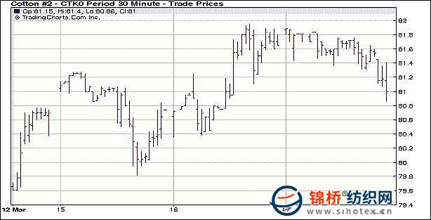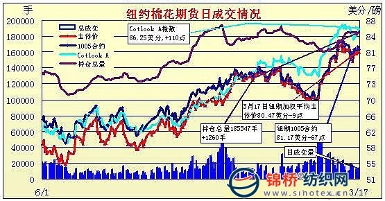 3月17日紐約期棉成交清淡,市場(chǎng)仍以觀望為主,在賣盤打壓下,期棉中幅收跌。當(dāng)日期棉市場(chǎng)高開低走,5月合約開盤最高至81.90美分/磅。雖然昨日美元走弱,外圍谷物市場(chǎng)走強(qiáng),但期棉受到賣盤打壓,價(jià)格走弱,盤終中幅收低。5月合約收于81.17美分/磅,跌67點(diǎn);7月合約收于81.99美分/磅,跌40點(diǎn)。 紐約棉花期貨近期1005合約近三個(gè)交易日交易走勢(shì) |