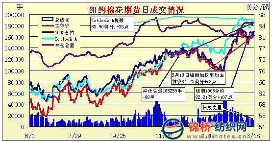 3月18日紐約期棉無(wú)視外圍市場(chǎng)走勢(shì),在美棉出口周報(bào)數(shù)據(jù)支持下買(mǎi)盤(pán)支撐大幅收高,主力合約漲幅過(guò)百,當(dāng)日成交量有所增加。當(dāng)日雖美元走強(qiáng),商品期貨市場(chǎng)走弱,但期棉脫離外圍市場(chǎng)強(qiáng)勢(shì)上漲。棉市高開(kāi)高走,低位時(shí)貿(mào)易買(mǎi)盤(pán)介入支撐價(jià)格震蕩走高,并觸發(fā)止損買(mǎi)盤(pán),助價(jià)格進(jìn)一步攀高,主力合約最高至82.48美分/磅。盤(pán)終期棉收于高位,5月合約收于82.21美分/磅,漲104點(diǎn);7月合約收于83.04美分/磅,漲105點(diǎn);其它合約略顯弱勢(shì),漲幅在12-75點(diǎn)不等。昨日美棉出口周報(bào)公布前周美國(guó)陸地棉出口6萬(wàn)噸,為四周來(lái)高點(diǎn),高于市場(chǎng)預(yù)期,對(duì)市場(chǎng)來(lái)帶一定利好。但中國(guó)簽約為負(fù)1973噸,土耳其、越南簽約分別達(dá)2.75萬(wàn)噸和1.72萬(wàn)噸,占當(dāng)周美棉出口總量的69%。 紐約棉花期貨近期1005合約近三個(gè)交易日交易走勢(shì) |