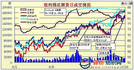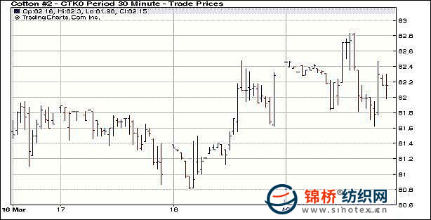 3月19日紐約期棉成交清淡,受外圍市場(chǎng)影響,在賣盤打壓下微幅收跌。當(dāng)日市場(chǎng)高開(kāi)低走,開(kāi)盤后微幅震蕩,午盤時(shí)一度走高,5月合約最高至82.83美分/磅。后美元走強(qiáng),施壓于商品市場(chǎng),谷物、原油及黃金紛紛走弱,期棉市場(chǎng)受外圍拖拽,價(jià)格下滑,盤終微幅收跌,5月合約收于82.18美分/磅,跌3點(diǎn);7月合約收于82.98美分/磅,跌6點(diǎn);其它遠(yuǎn)期合約漲跌不一。 紐約棉花期貨近期1005合約近三個(gè)交易日交易走勢(shì) |