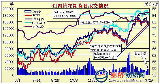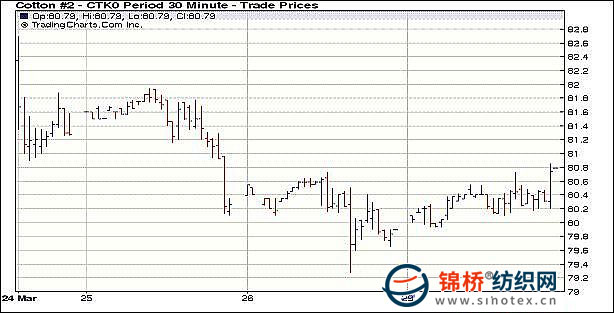3月29日紐約期棉受美元及外圍商品市場影響,在投機(jī)買盤支持下中幅收高,5月合約收盤價(jià)重新站上80美分一線。市場成交仍不活躍,期待明晚的USDA預(yù)測。當(dāng)日市場小幅高開后震蕩走高,由于美元弱勢下跌,商品市場獲得支持,大豆、玉米和原油期貨走強(qiáng),紐約期棉受外圍提振,在投機(jī)盤的支持下中幅走高,盤終5月合約收于80.43美分/磅,漲74點(diǎn);7月合約收于81.64美分/磅,漲68點(diǎn)。 紐約棉花期貨近期1005合約近三個(gè)交易日交易走勢 |