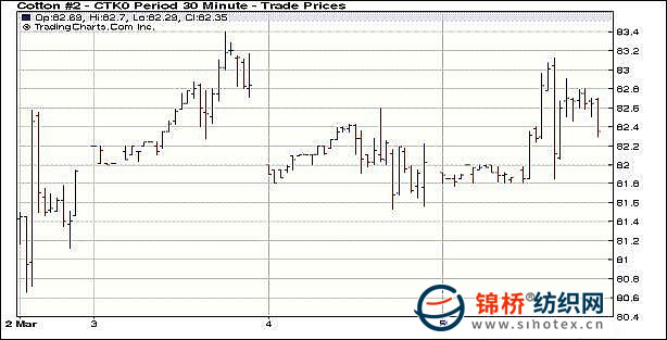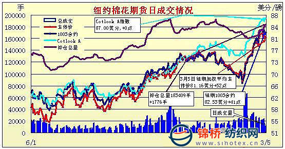 3月5日,美國(guó)經(jīng)濟(jì)前景向好的預(yù)期繼續(xù)給商品市場(chǎng)增添樂(lè)觀情緒。當(dāng)日,商品期貨普遍走強(qiáng),支撐紐約期棉小幅收高。分析師認(rèn)為,84.60美分或成為棉價(jià)近期的頂部,但在80美分以下應(yīng)有良好的現(xiàn)貨支撐。另外,如果價(jià)格跌至81.50美分以下可能引發(fā)技術(shù)性賣盤。當(dāng)日5月合約開盤價(jià)81.90(美分/磅,下同),最高價(jià)83.12,最低價(jià)81.77,收盤價(jià)82.40,結(jié)算價(jià)82.53,漲61點(diǎn),當(dāng)日登記庫(kù)存618420包,增加17432包,57516包待驗(yàn),成交量10270手,減少了604手。 紐約棉花期貨主力1005合約近三個(gè)交易日交易走勢(shì) |