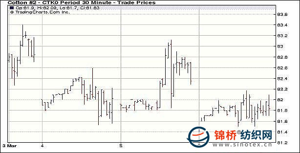 3月8日紐約期棉交投清淡,觀望為主,在少量賣盤打壓下,期棉主力合約走弱并小幅收跌,遠(yuǎn)期合約相對強(qiáng)勢。當(dāng)日期棉市場平開低走,在部分獲利回吐賣盤打壓下主力合約最低至81.34美分/磅;此外美元走強(qiáng)施壓于美國股市,也為棉市帶來利空。后低位買盤介入,棉價(jià)略有反彈,盤終前4個(gè)合約小幅收跌,近期3月合約收于82.15美分/磅,跌38點(diǎn);主力5月合約收于82.04美分/磅,跌39點(diǎn);其它遠(yuǎn)期合約微幅收漲。由于USDA報(bào)告將于明日公布,因此市場觀望氣氛濃厚,靜候新的指引。 紐約棉花期貨主力1005合約近三個(gè)交易日交易走勢 |