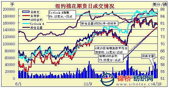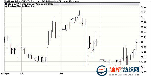 4月19日高盛事件余波未了,美元沖高回落,大宗商品探底后回升,紐約期棉走勢類似,盤中低位徘徊,尾盤基本收回跌勢。當(dāng)日紐約期棉開盤后再度下滑,部分原因是延續(xù)上周五的跌勢,同時美元繼續(xù)沖高,導(dǎo)致外圍普遍走弱,對于期棉產(chǎn)生壓力,因此ICE期棉趨弱,盤中近期5月合約最低逼近79美分,但低位貿(mào)易買盤支撐,同時外圍大多商品收窄跌幅,助推紐約期棉緩慢爬升,至尾盤之際基本收回跌幅。