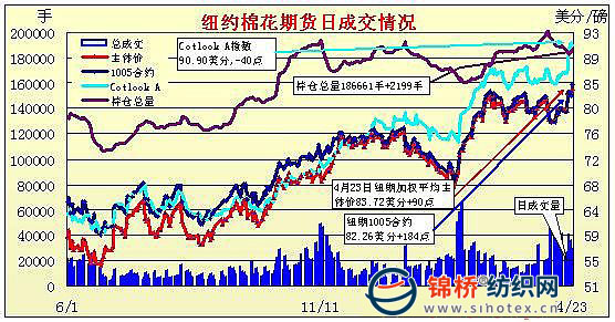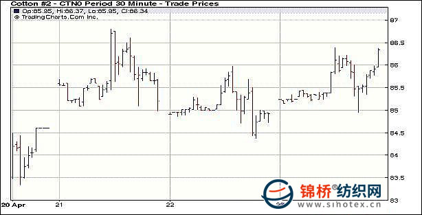 4月23日,美元回落,原油攀高,紐約期棉走勢(shì)強(qiáng)勁,穩(wěn)定的需求推動(dòng)期棉再度攀升,盤終7月主力合約漲138點(diǎn)收于86.20美分。當(dāng)日早盤,期棉小幅震蕩,隨后在外圍利好氛圍下快速拉升沖高,主力7月合約最高飆升至86.38美分,高位回落,不過(guò)基于現(xiàn)貨面穩(wěn)定的需求,美棉簽約的大幅增加刺激本年度2份合約再度大漲,直至收盤,成交較前幾日有明顯縮量。 紐約棉花期貨近期1007合約近三個(gè)交易日交易走勢(shì) |