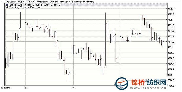 5月10日紐約期棉再度小漲,主要受外部商品市場整固影響。投資者信心有所恢復外部商品市場、股市和匯率市場穩(wěn)定,期棉獲益。7月合約收于81.04美分/磅,漲33點,1012月合約76.40美分,漲73點。受到歐洲將投入近1萬億美元來阻止希臘債務危機蔓延的利好消息推動,周一美國股市大幅收高,主要股指均獲得了今年最大漲幅,期棉市場也同樣獲益走高,7月合約最高上漲至82.16美分/磅,漲幅達到135點。后市因交易商擔心期貨高位無法吸引中國等買家采購現貨,市場回吐部分漲幅,終以小漲收盤。 紐約棉花期貨首期1007合約近三個交易日交易走勢 |