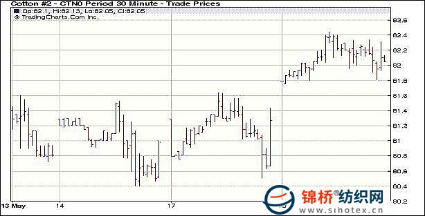 5月18日紐約期棉逆市全面上漲,近遠期合于的價差再度拉大,近期7月合約收于82.20美分/磅,漲100點,1012月合約77.91美分/磅,漲49點。當日期棉市場高開高走后穩(wěn)步上揚,7月合約挑戰(zhàn)82.50美分/磅的阻力位失敗,但最終仍收于近高點。中國期現(xiàn)貨市場上揚以及增發(fā)配額的預期,對美盤期貨給予支持。 紐約棉花期貨首期1007合約近三個交易日交易走勢 |