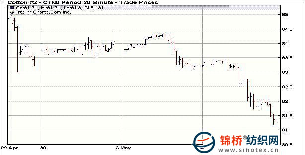 5月4日,外部商品市場(chǎng)下跌,給期棉市場(chǎng)帶來壓力,紐約期棉一路下滑,跌至近兩周來的低位,創(chuàng)4月中旬來的單日最大跌幅。主力7月合約結(jié)算價(jià)81.29美分/磅,跌194點(diǎn),1012月合約跌81點(diǎn),收于77.08美分/磅。美元走強(qiáng),外部商品市場(chǎng)整體下跌,以及歐洲債務(wù)危機(jī)加深美股重挫,期棉受到牽連也全面下跌,7月合約跌破82.25美分的支撐位后引發(fā)止損賣單,繼續(xù)走低,最終大幅收跌。 紐約棉花期貨近期1007合約近三個(gè)交易日交易走勢(shì) |