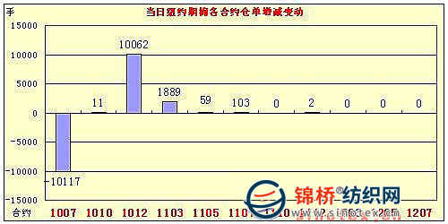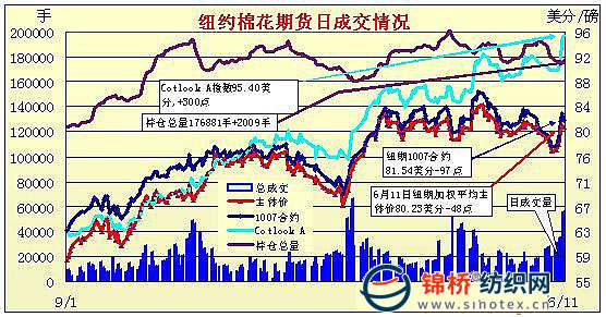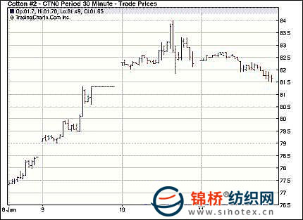 繼3個(gè)日來連續(xù)大漲過后,6月11日紐約期棉全面收跌,當(dāng)日賣盤活躍,其中近期合約相對(duì)弱勢(shì)。當(dāng)日市場低開低走,近日來連續(xù)上漲導(dǎo)致市場中出現(xiàn)大量獲利回吐賣盤,對(duì)市場形成壓力,同時(shí)午盤后有大量基金轉(zhuǎn)倉交易,7月合約壓力更甚,最低至81.49美分/磅。盤終各合約均收跌,7月合約收于81.54美分/磅,跌97點(diǎn);12月合約收于78.94美分/磅,跌13點(diǎn)。 紐約棉花期貨首期1007合約近三個(gè)交易日交易走勢(shì) |