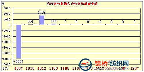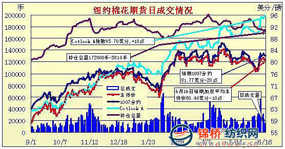 6月16日,經(jīng)濟(jì)形勢(shì)趨穩(wěn),原油收至近期新高,但紐約期棉上下兩難,窄幅震蕩,盤終近期合約小幅收跌,而新花合約基本收平。當(dāng)日紐約期棉走勢(shì)平淡,早盤小幅下跌,但當(dāng)天交易以展倉(cāng)交投為主,上升和下跌動(dòng)力均不強(qiáng),因此窄幅震蕩,盤終依然漲跌不一,近期合約跌20點(diǎn),而12月合約漲8點(diǎn)。交投明顯縮量,近期合約臨近交割通知日,大幅減倉(cāng),市場(chǎng)資金涌入12月合約。 紐約棉花期貨首期1007合約近三個(gè)交易日交易走勢(shì) |
