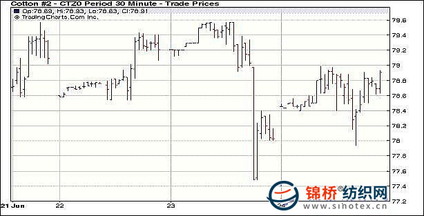 6月24日紐約期棉成交清淡,各合約小幅收漲,第一交割通知日7月合約交割476手。當(dāng)日市場(chǎng)高開(kāi)震蕩,市場(chǎng)交易冷清,觀望氣氛濃厚。午盤(pán)后有部分賣(mài)盤(pán)涌現(xiàn),棉價(jià)快速下滑,12月合約最低至77.89美分/磅,但由于后續(xù)賣(mài)盤(pán)力量不足,價(jià)格很快反彈。盤(pán)終7月合約收于84.48美分/磅,漲3點(diǎn);12月合約收于78.72美分/磅,漲56點(diǎn)。 紐約棉花期貨主力1012合約近三個(gè)交易日交易走勢(shì) |