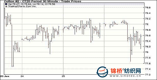6月28日紐約期棉成交量略有增加,但受外圍市場走弱影響,期棉市場仍較為冷清,繼續(xù)靜候周三的USDA美棉種植報(bào)告;期棉多數(shù)合約小幅收跌。當(dāng)日市場低開后窄幅震蕩,午盤后出現(xiàn)大幅下滑,主力12月合約最低至77.67美分/磅,較開盤低133點(diǎn),隨后反彈。盤終多數(shù)合約小幅收跌,7月合約收于84.49美分/磅,跌23點(diǎn);12月合約收于78.45美分/磅,跌46點(diǎn)。 紐約棉花期貨主力1012合約近三個(gè)交易日交易走勢(shì) |