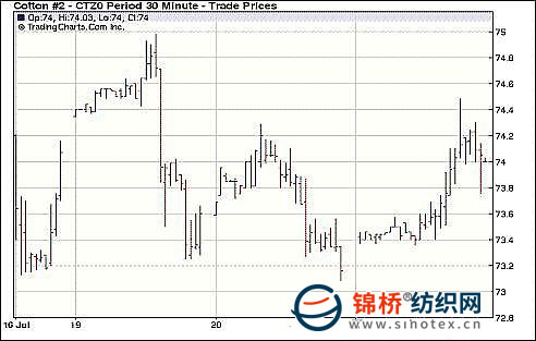 7月21日,美聯(lián)儲主席伯南克表示美國經(jīng)濟(jì)依然面臨較多的不確定性,美聯(lián)儲準(zhǔn)備在需要的時(shí)候采取進(jìn)一步措施提振經(jīng)濟(jì),美國股市受挫回落,紐約期棉在73美分支撐處技術(shù)買盤,推動期棉反彈走高,盤終紐約期棉收漲百點(diǎn)左右。隨著期棉合約前兩日連續(xù)下跌逼近73美分,技術(shù)買盤于21日入場,紐約期棉小幅高開并走升,顯示期棉12月在73美分的支撐較強(qiáng),不過成交低迷,持倉繼續(xù)萎縮,盤終期棉主力合約略有回落,但最終收漲近百點(diǎn)。分析人士認(rèn)為,期棉短期或?qū)⒗^續(xù)維持73-75美分的區(qū)間震蕩。后市美棉長勢良好,同時(shí)傳言印度棉種植面積增幅較大,均將為期棉帶來壓力。 紐約棉花期貨主力1012合約近三個(gè)交易日交易走勢 |