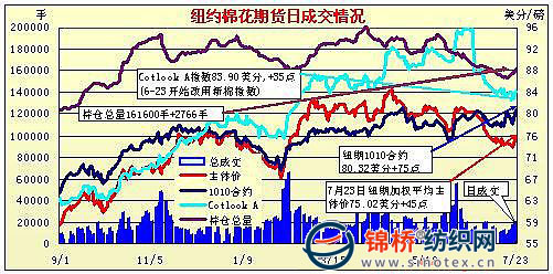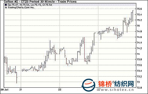7月23日,外圍市場沒有大的消息,大宗商品漲跌不一,由于庫存大幅下降提振期棉走勢,盤終近期合約和主力合約中幅收漲,其他大多合約微弱上揚。當(dāng)日紐約期棉早盤窄幅震蕩,由于登記庫存6月以來持續(xù)大幅減少,截止23日登記庫存僅有5.5萬包,為2004年以來低位,庫存的大幅減少刺激期棉走高,主力12月合約盤中最高75.54美分/磅,盤終75.34,突破近期波動區(qū)間的上限75美分,成交略有活躍。 紐約棉花期貨主力1012合約近三個交易日交易走勢 |