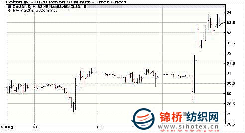 市場(chǎng)觀望多日的USDA(美國(guó)農(nóng)業(yè)部)供需預(yù)測(cè)報(bào)告出臺(tái),結(jié)果出人意料,紐約期棉大幅上漲,近期10月合約收于86.75美分/磅,漲253點(diǎn),主力12月合約83.55美分,漲265點(diǎn)。美農(nóng)業(yè)部8月份全球棉花產(chǎn)銷預(yù)測(cè)報(bào)告中,在調(diào)增10/11年度棉花產(chǎn)量和消費(fèi)量的同時(shí),也大幅調(diào)低09/10年度期末庫(kù)存量,導(dǎo)致10/11年度期末庫(kù)存大幅下降至千萬(wàn)噸以下。數(shù)據(jù)顯示,09/10年度,全球棉花期末庫(kù)存1035.9萬(wàn)噸,較7月份下調(diào)74.2萬(wàn)噸。其中中國(guó)419.8萬(wàn)噸,調(diào)減26.3萬(wàn)噸、印度減25.1萬(wàn)噸、巴基斯坦減13.4萬(wàn)噸、美國(guó)增加4.4萬(wàn)噸。10/11年度,全球棉花產(chǎn)量預(yù)計(jì)2544.1萬(wàn)噸,調(diào)增18.1萬(wàn)噸。其中印度增21.8萬(wàn)噸、美國(guó)增5.1萬(wàn)噸、巴基斯坦減15.3萬(wàn)噸。全球消費(fèi)2631.6萬(wàn)噸,調(diào)增25.4萬(wàn)噸。其中中國(guó)1088.6萬(wàn)噸,調(diào)增21.7萬(wàn)噸。10/11年度全球期末庫(kù)存993萬(wàn)噸,調(diào)減93.7萬(wàn)噸,較上年度減少42.9萬(wàn)噸。其中中國(guó)364.8萬(wàn)噸,調(diào)減40.5萬(wàn)噸,比上年度減少55萬(wàn)噸。