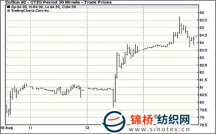 8月13日紐約期棉多漲少跌,近期10月合約收于87.49美分/磅,漲74點,主力12月合約收于84.18美分/磅,漲63點。USDA(美國農(nóng)業(yè)部)在12日發(fā)布的供需報告利好延續(xù),市場開盤穩(wěn)定,盤中12月合約最高上漲到85.71美分/磅,漲幅再過200點。但受經(jīng)濟層面不利消息影響,期棉從高點回落,回吐大部分漲幅,最終漲跌互現(xiàn)。基本面上美棉出口勢頭強勁,巴基斯坦棉花產(chǎn)量調低,對市場形成支持,但經(jīng)濟層面眾多疲軟的經(jīng)濟數(shù)據(jù)表明經(jīng)濟復蘇步伐放緩,重新激起了投資者對美國經(jīng)濟陷入二次衰退的憂慮,對市場上行形成壓力。 紐約棉花期貨主力1012合約近三個交易日交易走勢 |