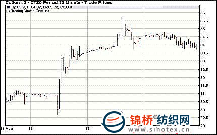 8月16日,紐約期棉未延續(xù)瘋漲勢頭,高位盤整,尾盤大多數(shù)合約小幅收跌。當(dāng)日外圍大宗商品漲跌不一,農(nóng)產(chǎn)品大多小幅回調(diào),而紐約期棉走勢平淡,12月合約并未突破揚(yáng)升,盤中低位83.72美分,尾盤微弱收跌,成交量明顯活躍。 紐約棉花期貨主力1012合約近三個(gè)交易日交易走勢 |
