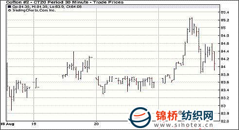 8月23日紐約期棉直上直下全線反彈,近期10月合約收于87.65美分/磅,漲50點,主力12月合約84.09美分/磅,漲54點,交易商繼續(xù)炒作巴基斯坦和中國部分棉區(qū)天氣不佳的問題。市場開盤穩(wěn)定,受技術(shù)買盤及投機買盤推動,12月合約從開盤的83.57美分開始突破了85美分,向86美分發(fā)起挑戰(zhàn),但因獲利了結(jié)賣盤打壓,12月合約止步于85.26美分,調(diào)頭向下,最終收于84美分一線水平。 紐約棉花期貨主力1012合約近三個交易日交易走勢 |