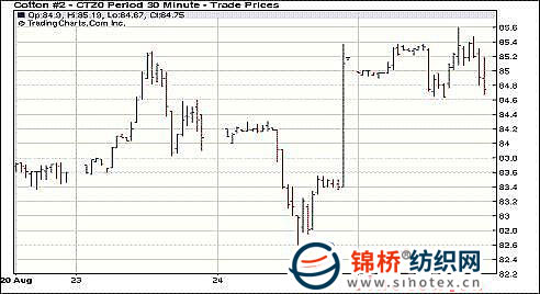 8月25日紐約期棉先揚后抑,弱勢收盤,近期10月合約收于88.15美分/磅,跌27點,主力12月合約84.86美分/磅,跌36點。印度和巴基斯坦相關(guān)的消息對市場形成壓力。當日市場弱勢開盤,盤中有買盤支持反彈,12月合約最高上漲至85.60美分,超過前一個交易日的最高點。印度出現(xiàn)利好降雨,產(chǎn)量前景更為樂觀,巴基斯坦因洪災產(chǎn)量看減,但有消息稱巴基斯坦將通過增加印度棉進口量來補充用棉需求,另外,外部商品市場、股市和原油期貨盤中大跌,期棉受壓下滑,12月合約跌破85美分。雖然交易尾段外部商品市場全面反彈,期棉仍以弱勢收盤。 紐約棉花期貨主力1012合約近三個交易日交易走勢 |