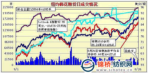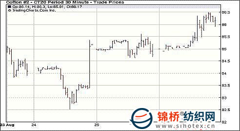 8月26日紐約期棉市場(chǎng)全面反彈,多數(shù)合約漲幅過百點(diǎn),近期10月合約89.24美分,漲109點(diǎn),主力12月合約86.15美分/磅,漲129點(diǎn)。當(dāng)日市場(chǎng)上半場(chǎng)交易平淡交易,但后半場(chǎng)交易中受外部商品市場(chǎng)反彈、美棉出口周報(bào)利好以及美國主產(chǎn)棉區(qū)德州氣溫過低,刺激買盤涌入,12月合約在突破前幾日高點(diǎn)85.67美分后沖上關(guān)鍵阻力位86美分,并收于該水平之上。據(jù)美國統(tǒng)計(jì)局?jǐn)?shù)據(jù),2009/10年度美棉的期末庫存64.2萬噸,低于美國農(nóng)業(yè)部(USDA)之前預(yù)測(cè)的67.5萬噸,這也預(yù)示著下一次預(yù)測(cè)結(jié)果中USDA會(huì)進(jìn)一步調(diào)低美棉期末庫存量。8.13-8.17一周美國凈簽約出口10/11年度陸地棉107184噸,較前周增6%;裝運(yùn)54749噸,較前周增1%;凈簽約出口本年度皮馬棉3084噸,較前周減6%;裝運(yùn)227噸,較前周減26%;此外凈簽約出口11/12年度陸地棉408噸。 紐約棉花期貨主力1012合約近三個(gè)交易日交易走勢(shì) |