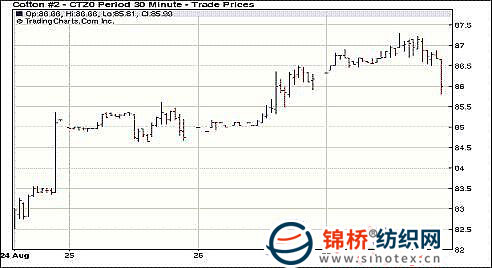 經(jīng)歷了前一個交易日的上漲,8月27日紐約期棉窄幅波動,近期10月合約收于89.03美分/磅,跌21點,主力12月合約86.07美分/磅,跌8點。市場盤中上沖至近兩年來的新高點。當(dāng)日市場穩(wěn)開高走,受基本面供應(yīng)偏緊的預(yù)期支撐,12月合約最高上漲至87.30美分/磅,達到近兩年來的高點。因期權(quán)相關(guān)賣盤和技術(shù)面壓力,市場從高位回落,以漲跌互現(xiàn)收盤。分析認為,市場近期已漲為主,此輪漲勢從7月21日啟動,雖然經(jīng)濟層面并不樂觀,給棉花消費前景帶來迷霧,但供應(yīng)偏緊的預(yù)期給市場“堅固”支撐。 紐約棉花期貨主力1012合約近三個交易日交易走勢 |