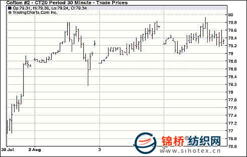 8月4日,雖然外部商品市場和美國股市上漲,但期棉因近期以漲為主,有一定的回調(diào)壓力,以小幅下跌結(jié)束連漲勢頭。近期10月合約收于84.00美分/磅,跌51點,主力12月合約79.47美分/磅,跌33點。市場整個交易日都在79-80美分/磅之間波動,早盤窄幅波動,盤中有意上攻,但因缺乏足夠買盤支持,12月合約最高止步于79.95美分,挑戰(zhàn)80美分再度宣告失敗,后以小幅下跌收盤。 紐約棉花期貨主力1012合約近三個交易日交易走勢 |