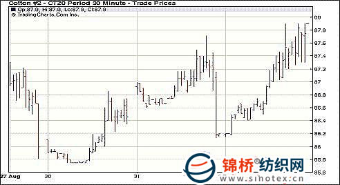 9月1日紐約期棉受外圍市場(chǎng)提振,多數(shù)合約收漲,其中主力12月合約漲幅過(guò)百。當(dāng)日期棉早盤(pán)走低,交投清淡。后美國(guó)經(jīng)濟(jì)數(shù)據(jù)利好刺激美股暴漲近3%,同時(shí)商品走強(qiáng),ICE期棉受外圍提振,在基金及投機(jī)買(mǎi)盤(pán)支持下,大幅攀升,12月合約最高至87.90美分/磅。盤(pán)終多數(shù)合約收漲,近期10月合約收于90.13美分/磅,漲105點(diǎn);12月合約收于87.41美分/磅,漲121點(diǎn)。 紐約棉花期貨主力1012合約近三個(gè)交易日交易走勢(shì) |