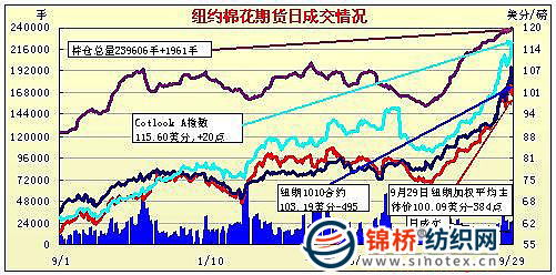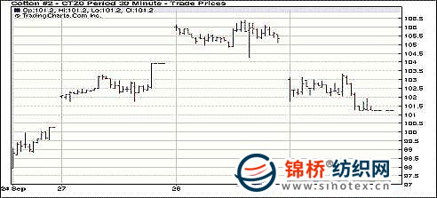 9月29日印度棉出口政策公布,中國期棉盤中跌停,紐約期棉遭遇強(qiáng)大賣壓,大多數(shù)合約收于跌停價(jià)位,12月合約收于101.24美分/磅。當(dāng)日期棉小幅高開后急速下滑,印度棉出口政策公布,另外中國棉花期貨大跌,均為ICE期棉帶來外圍壓力,期棉承壓回落,低位震蕩,盤中觸及跌停,之后少量投機(jī)買盤介入,促使期棉從跌停位拉起,但賣盤壓力導(dǎo)致ICE期棉再度跌停,并保持至盤終。由于周三跌停,周四ICE期棉漲跌停板再度擴(kuò)板至500點(diǎn)。 紐約棉花期貨主力1012合約近三個(gè)交易日交易走勢 |