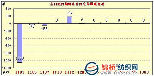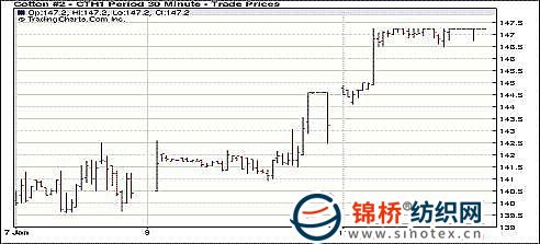 1月11日紐約期棉市場再度上漲,近期三份合約漲停,1112月合約盤中站上其歷史最高位,近期3月合約結算價147.25美1分/磅,1112月合約104.92美分/磅,漲240點。當日市場穩(wěn)定開盤后走強,受貿易商買盤和外部市場整體走強,期棉穩(wěn)步走高,交易后期受市場預期12日晚USDA(美國農業(yè)部)報告結果利好的影響,盤尾3月合約高位震蕩后止于漲停,1112月合約最高觸及105.2美分。 紐約棉花期貨近期1103合約近三個交易日交易走勢 |