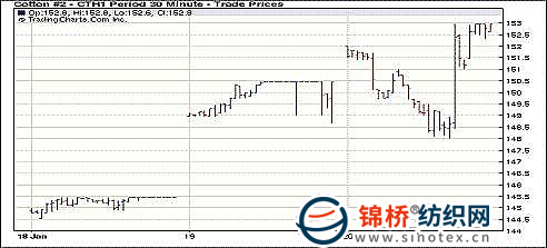 1月20日外部商品市場雖普遍下跌,但紐約期棉先抑后揚,近期合約152.94美分/磅,封于漲停板,1112月合約105.70美分/磅,漲122點。受美元上漲商品市場普跌以及預(yù)期中國將進一步調(diào)控以抑制通貨膨脹的影響,紐約期棉市場高開低走。外部市場雖未反彈,但期棉市場在貿(mào)易買盤和期權(quán)相關(guān)基金買盤推動,跌勢迅速扭轉(zhuǎn),近期合約升向漲停。 紐約棉花期貨近期1103合約近三個交易日交易走勢 紐約棉評:供應(yīng)憂慮持續(xù) 期棉收盤漲停