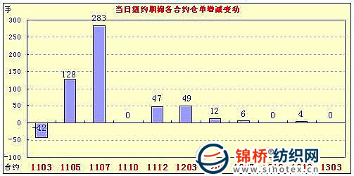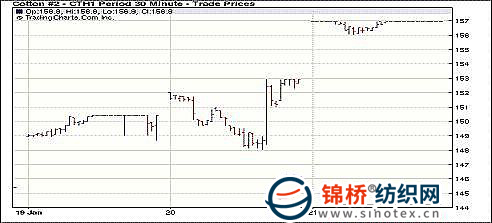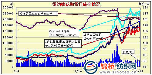 1月21日紐約期棉近期合約繼續(xù)漲停,收于156.94美分/磅,1112月合約108.74美分,漲304點(diǎn),盤(pán)中一度達(dá)到109.69美分/磅(+399點(diǎn))。美棉出口周報(bào)利好,給予市場(chǎng)支持。當(dāng)日市場(chǎng)開(kāi)盤(pán)漲勢(shì)如虹,近期3月合約直奔漲停板,上半場(chǎng)交易大部分市場(chǎng)停留于漲停,1112月合約距離漲停僅1點(diǎn)之差。中國(guó)電子盤(pán)市場(chǎng)走強(qiáng),內(nèi)外盤(pán)聯(lián)動(dòng)效應(yīng)給美盤(pán)帶來(lái)支持;外部市場(chǎng)美元貶值和商品市場(chǎng)走強(qiáng)激發(fā)更多上漲動(dòng)能。交易后期,有獲利了結(jié)賣(mài)盤(pán)出現(xiàn),3月合約和12月合約高位回落,因美棉出口周報(bào)利好,3月合約重返漲停,12月合約收漲300余點(diǎn)。據(jù)美國(guó)農(nóng)業(yè)部報(bào)告,1月7-13日美國(guó)凈簽約出口本年度陸地棉43363噸,比前一周增加66%,簽約進(jìn)口2010/2011年美棉新花數(shù)量57402噸,主要是中國(guó)簽約進(jìn)口(46902噸)。 紐約棉花期貨近期1103合約近三個(gè)交易日交易走勢(shì) |