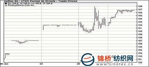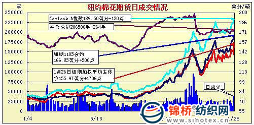 1月26日紐約期棉近期合約收于166.83美分/磅,封于漲停,1112月合約110.43美分/磅,漲176點(diǎn)。外部商品整體上漲,推動(dòng)期棉繼續(xù)走高。當(dāng)日市場(chǎng)早盤(pán)處于穩(wěn)定狀態(tài),盤(pán)中震蕩走高。奧巴馬的國(guó)情咨文以及美聯(lián)儲(chǔ)聲明令投資者感到振奮,美國(guó)股市及整個(gè)商品市場(chǎng)整體走高,期棉亦獲上漲動(dòng)能,近期3月合約最終走向漲停。 紐約棉花期貨近期1103合約近三個(gè)交易日交易走勢(shì) |