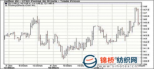 1月5日紐約期棉盤中波動(dòng)劇烈,以全面上漲收盤,近期3月合約145.20美分/磅,漲142點(diǎn),2011年12月合約100.02美分/磅,漲51點(diǎn)。5日美國(guó)相關(guān)機(jī)構(gòu)公布的勞動(dòng)力市場(chǎng)與服務(wù)業(yè)數(shù)據(jù)均好于預(yù)期,商品市場(chǎng)忽略美元走強(qiáng)的因素全面上漲,期棉早盤沖高,3月合約突破多個(gè)止損買單,一度占上漲停位置。交易后期市場(chǎng)遇獲利了結(jié)賣盤打壓回吐部分漲幅,最終3月合約漲百余點(diǎn)。 紐約棉花期貨近期1103合約近三個(gè)交易日交易走勢(shì) 紐約棉評(píng):澳大利亞洪水憂慮 推動(dòng)期棉收高