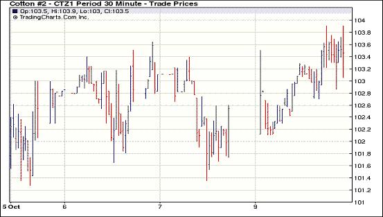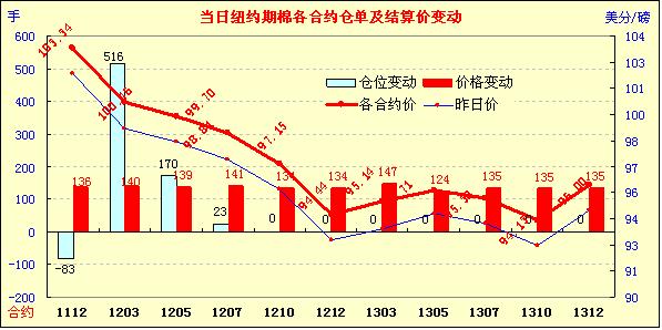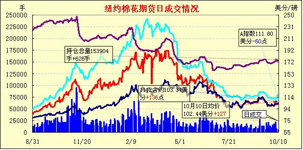在外圍谷物、油籽及原油市場(chǎng)走高帶動(dòng)下,10月10日紐約期棉全面收漲,主力1112月合約結(jié)算價(jià)103.34美分/磅,漲136點(diǎn),1203月合約結(jié)算價(jià)100.46美分/磅,漲140點(diǎn)。棉市成交持續(xù)清淡。當(dāng)日市場(chǎng)震蕩走高,盤(pán)中主力合約突破上周五高點(diǎn)103.64美分/磅,當(dāng)日最高至103.90美分/磅(+56點(diǎn));尾盤(pán)時(shí)受賣(mài)盤(pán)打壓回吐部分漲幅,盤(pán)終主力合約大幅告漲,其他遠(yuǎn)期合約漲幅在124-147點(diǎn)不等。德國(guó)和法國(guó)領(lǐng)導(dǎo)人承諾月底前提出新的綜合性計(jì)劃,向歐元銀行業(yè)注資,以解決貸款問(wèn)題。受這一消息影響,歐元周一上漲,美元指數(shù)受到打壓。美國(guó)農(nóng)業(yè)部(USDA)將于周三公布最新全球棉花供需預(yù)測(cè)。業(yè)內(nèi)預(yù)測(cè)美棉產(chǎn)量將有所調(diào)減,主要因德州和佐治亞州的采摘進(jìn)展報(bào)告并不樂(lè)觀。此外由于經(jīng)濟(jì)前景的不確定性,棉花的消費(fèi)量可能也出現(xiàn)下調(diào)。