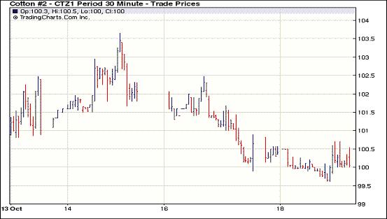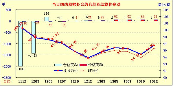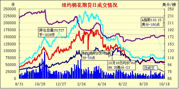 10月18日美元指數(shù)走弱、美國(guó)股市走強(qiáng)對(duì)商品市場(chǎng)形成支撐,紐約期棉遠(yuǎn)期合約受到提振;但受歐債危機(jī)前景不佳的低迷情緒影響,期棉近期合約延續(xù)前一日的跌勢(shì)再度下滑。當(dāng)日收盤前四個(gè)合約小幅收跌,主力1112月合約結(jié)算價(jià)100.18美分/磅,跌18點(diǎn),1203月合約結(jié)算價(jià)98.21美分/磅,跌25點(diǎn);其它遠(yuǎn)期合約收漲6-62點(diǎn)不等。當(dāng)日市場(chǎng)早盤震蕩走低,主力1112月合約跌破前一日低點(diǎn)99.89美分/磅(-54點(diǎn)),至當(dāng)日最低99.61美分/磅(-75點(diǎn));后外圍市場(chǎng)上揚(yáng)促部分買盤涌入,主力合約受支撐至當(dāng)日最高點(diǎn)100.82美分/磅,當(dāng)日震蕩幅度121點(diǎn);尾盤時(shí)買盤撤退,該合約回吐漲幅,盤終主力合約小幅收跌。美元指數(shù)昨日走低促使美國(guó)股市及部分商品市場(chǎng)走強(qiáng),但由于德國(guó)提出的解決歐元區(qū)主權(quán)債務(wù)危機(jī)的方案并不現(xiàn)實(shí),市場(chǎng)信心受到壓制,導(dǎo)致棉市近期合約持續(xù)走低。